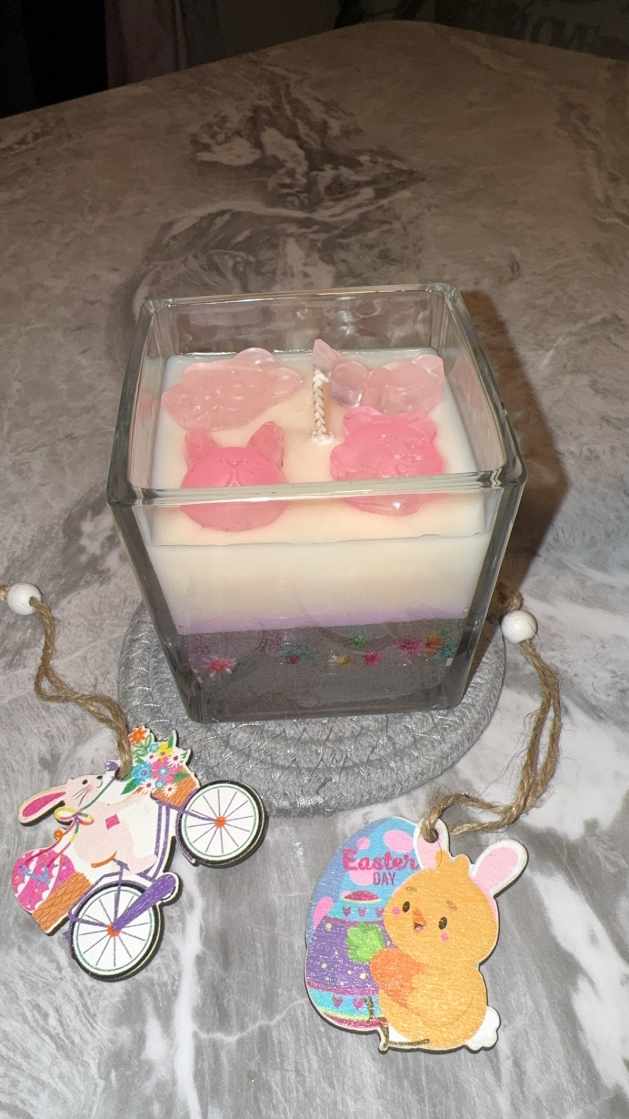 Celebrate the beauty of spring with our Easter Floral Candle. This handmade candle features soft pastel layers and delicate floral details inspired by blooming spring gardens. The decorative base with colorful blossoms adds a unique touch, making it perfect for Easter décor, gifts, or bringing a warm and peaceful glow to your home.